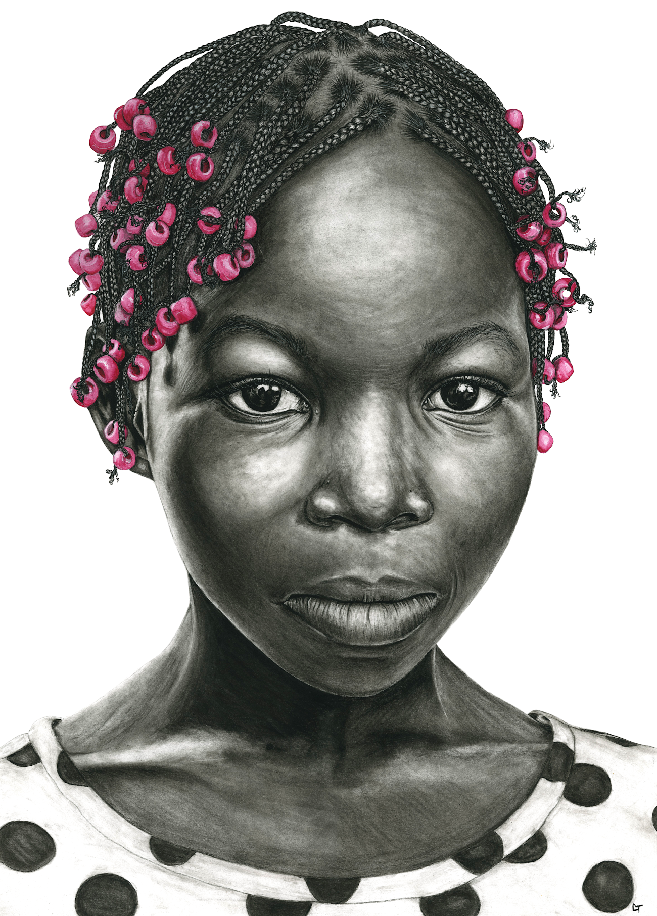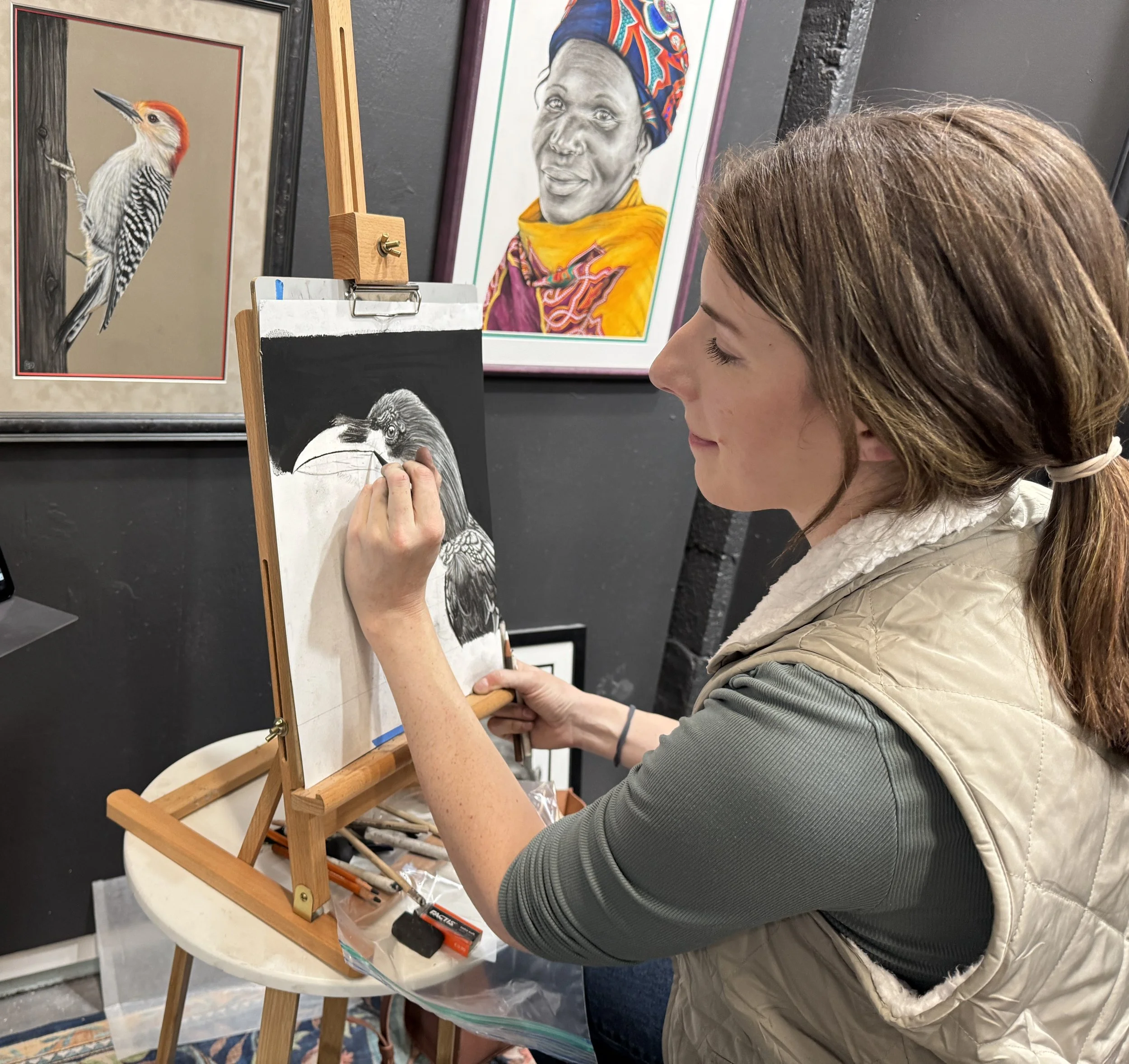 Her artistic journey began in 2017 during her yearlong service trip to southeast Africa. Limited internet access and dependency on solar power created the need for a more traditional means of entertainment, and she began experimenting with the assorted paint and drawing supplies she had on hand. After initial practice drawing African wildlife she saw in nature magazines, she transitioned to drawing her friends and neighbors. She has a great love for drawing eyes and the reflections they cast, for wrinkles and facial detail, and for the brightly colored headwraps that the women she met in Mozambique would wear.